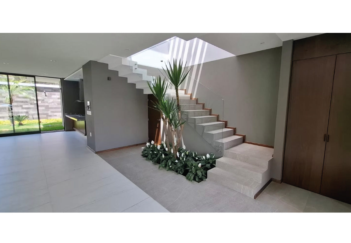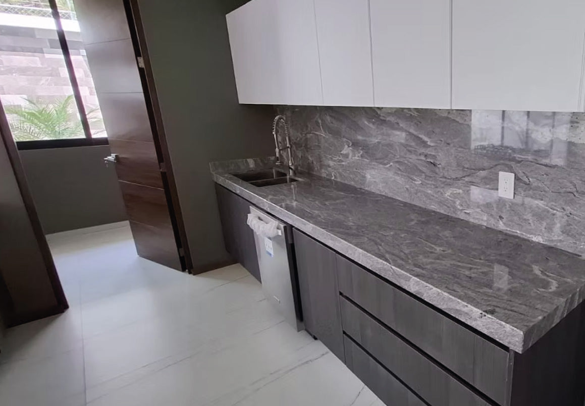 Instalaciones: Recubrimiento de piedra y madera natural, cubierta de granito, cocina equipada con parrilla, campana extractora, horno de gas, microondas y lavavajillas, calentador de paso, sistema de distribución de agua con hidroneumático, cisterna y sistema de riego automático en jardines.
