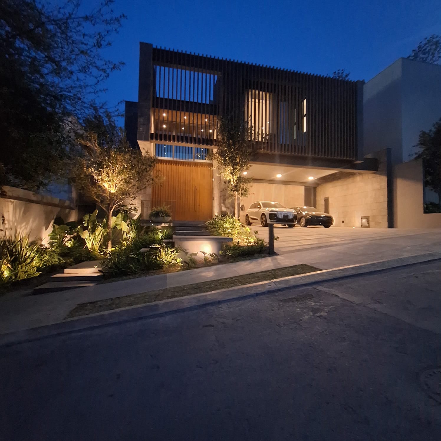 Cocina integral amplia con barra desayunador, refrigerador marca KitchenAid, horno, microondas, estufa y alacena amplia y elevador que conecta todos los niveles, cochera techada para 3 autos o 6 autos en batería con centro de carga eléctrica con puerta de acceso a la residencia.
