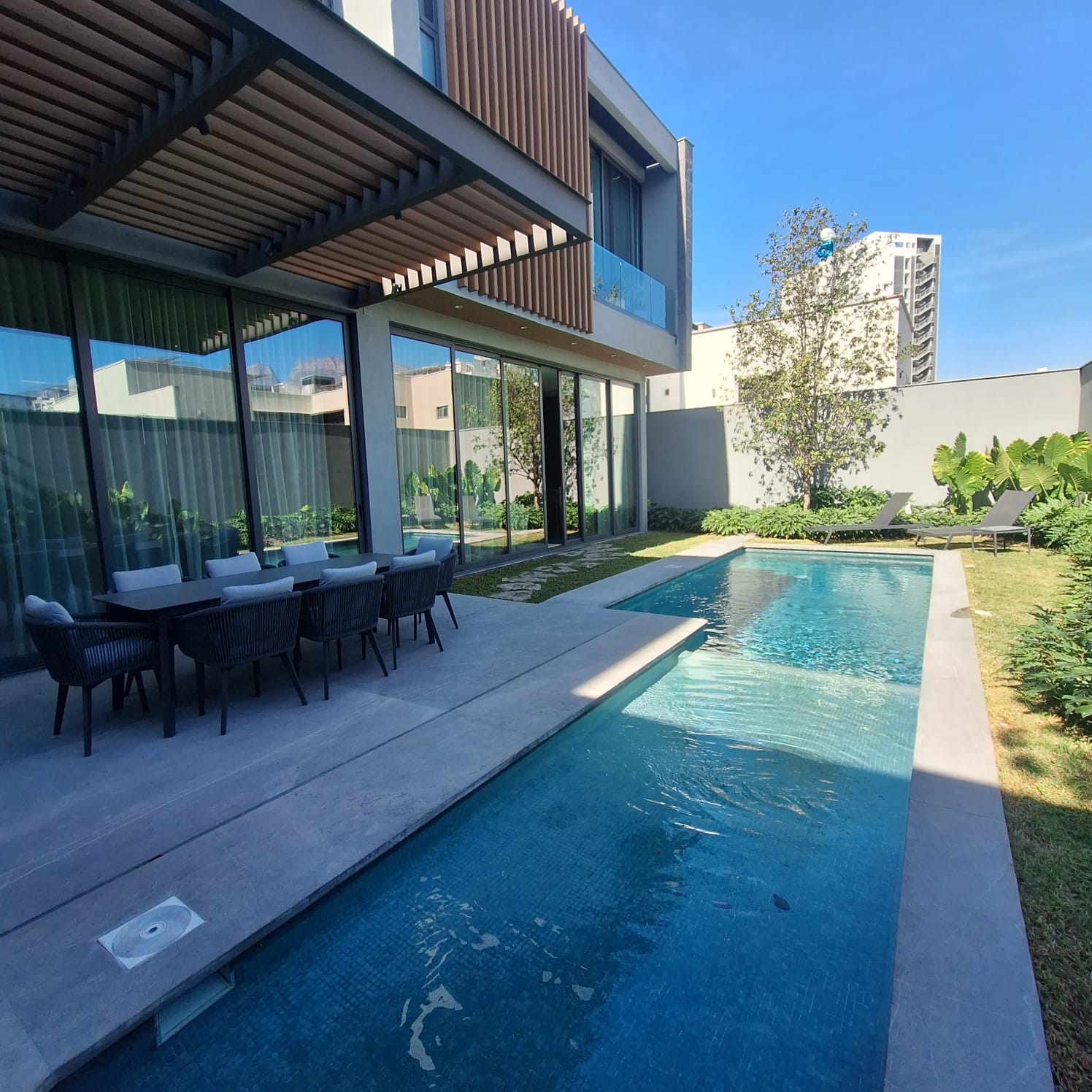 Jardín con alberca orientado al sur poniente. Ideal para tener un clima agradable al exterior. Comedor exterior para 8 personas, asador y acceso a medio baño por fuera.