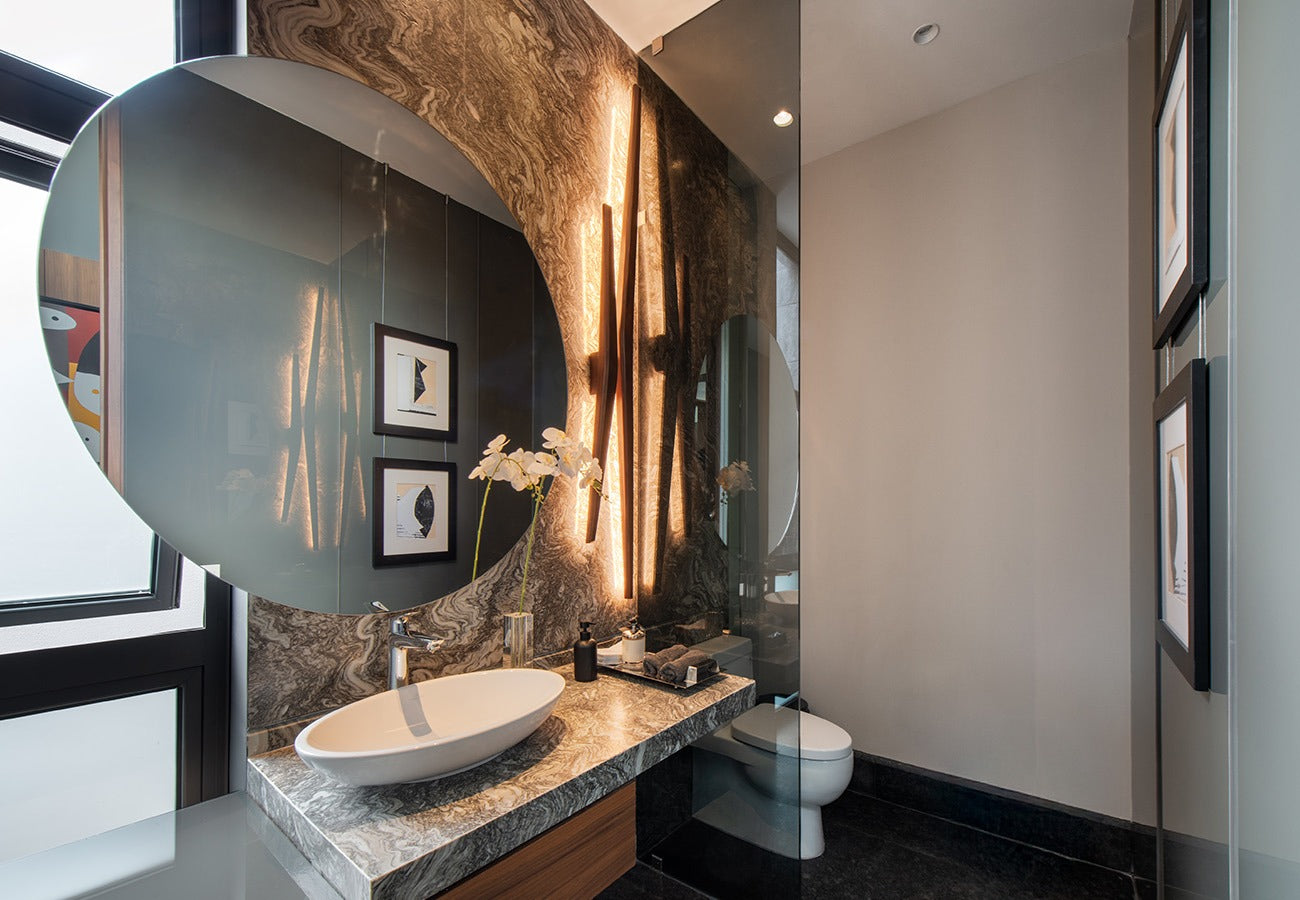 Cuarto de TV con baño completo con acabados de mármol en planta baja por lo que puede ser una recámara de invitados.