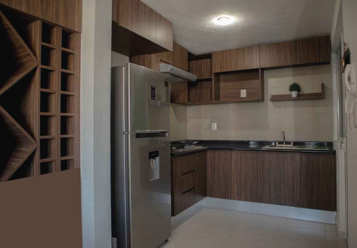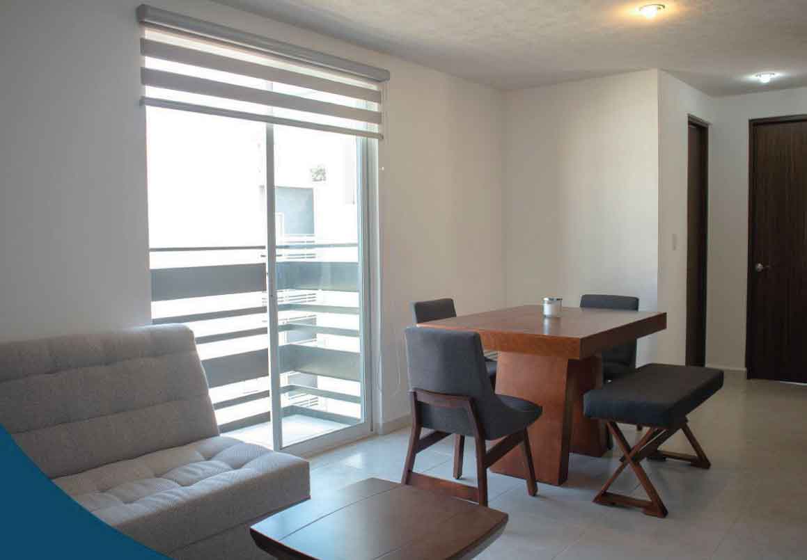 DEPARTAMENTO AMUEBLADO EN RENTA EN QUINTA CANTERA, MORELIA. Cuenta con cocina integral, sala - comedor, 2 recámaras, 1 baño completo y un cajón de estacionamiento. Fraccionamiento privado con seguridad las 24 hrs.